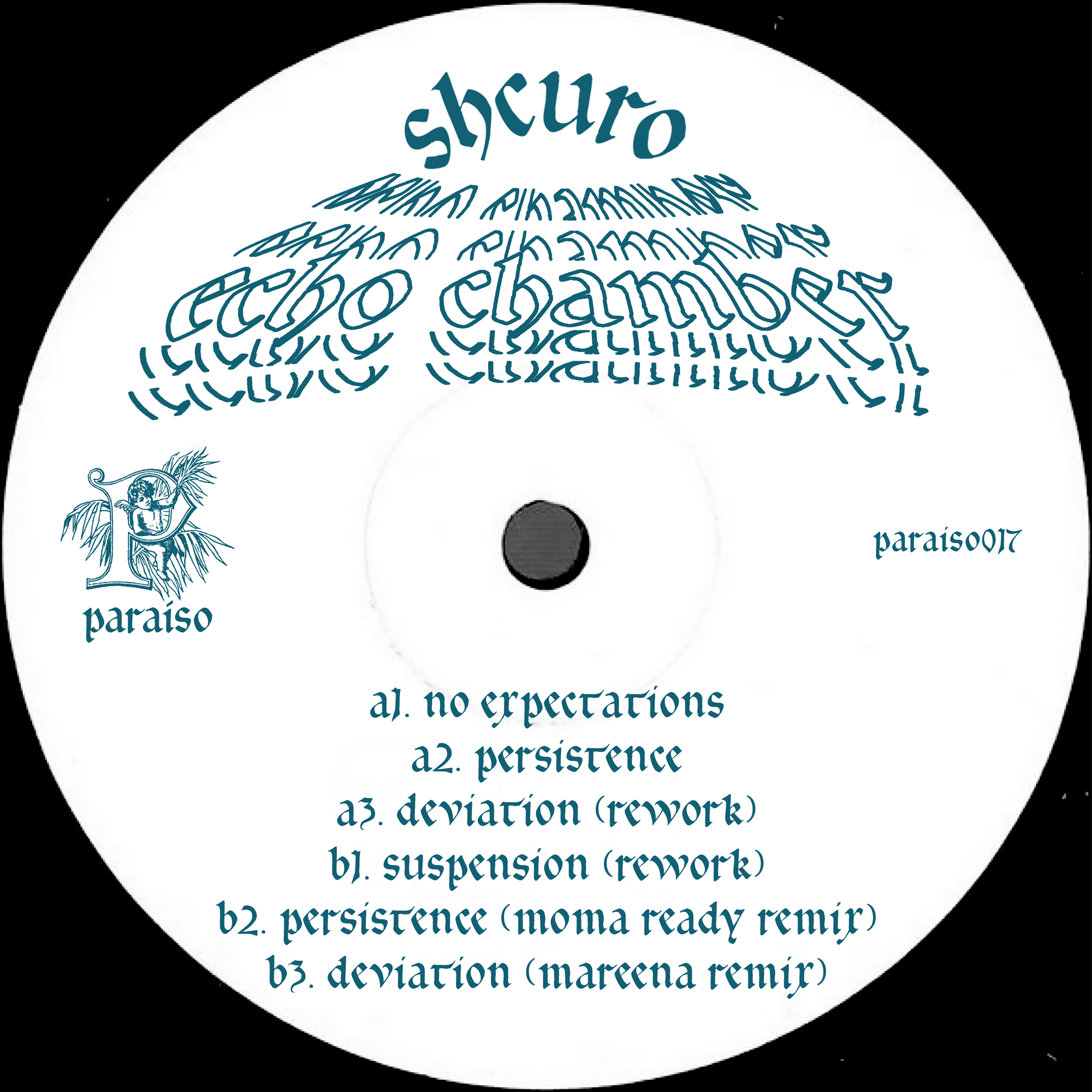 Fresh off producing a seminal documentary about the origin story of Portuguese rave culture, Shcuro returns to his mother tongue, music, to give us four slices of fresh yet classic Lisbon underground flavour right as the summer sets in. ‘Echo Chamber’ EP, Para?so’s 17th outing, comes with two equally excellent remixes separated by the atlantic: Brooklyn’s MoMA Ready and Berlin’s Mareena. Side A starts with two tracks first blueprinted this past year as Shcuro prepared a new live set. ‘No Expectations’ opens the record with a high-paced sweat-breaker that elegantly evokes early rave culture as stabs, funk and feelings abound. A2 ‘Persistence’ follows suit with the work that exudes proficiency: sound design, dub techno learnings and masterful layering all conspire to create a moment of pure techno draw. Closing side A, ‘Deviation’ pulls some of the previous track’s energy even though it’s a rework from the artist’s earlier unreleased catalogue: another sign that we’re talking realness here. Clever percussion and refreshing washes drive us well into dubby territories. ‘Suspension’ opens the B side, picking up where it left off with the last original: a beautifully produced piece with fleeting mutating stabs that seem to swim alongside us in an imaginary oceanic dancefloor. Liquid, refreshing sensorial motifs seem to underpin this record and that spirit spills into the remix pack, starting off with MoMA Ready’s take on ‘Persistence’, bringing out the rawness in the original while adding a special sauce with Robert Hood-like funky yet minimalistic bleep work. Tresor’s Mareena steps in for a centered, dancefloor-geared – but still mysterious – twist on ‘Deviation’, perfectly rounding up the record with the expertise of a club resident.